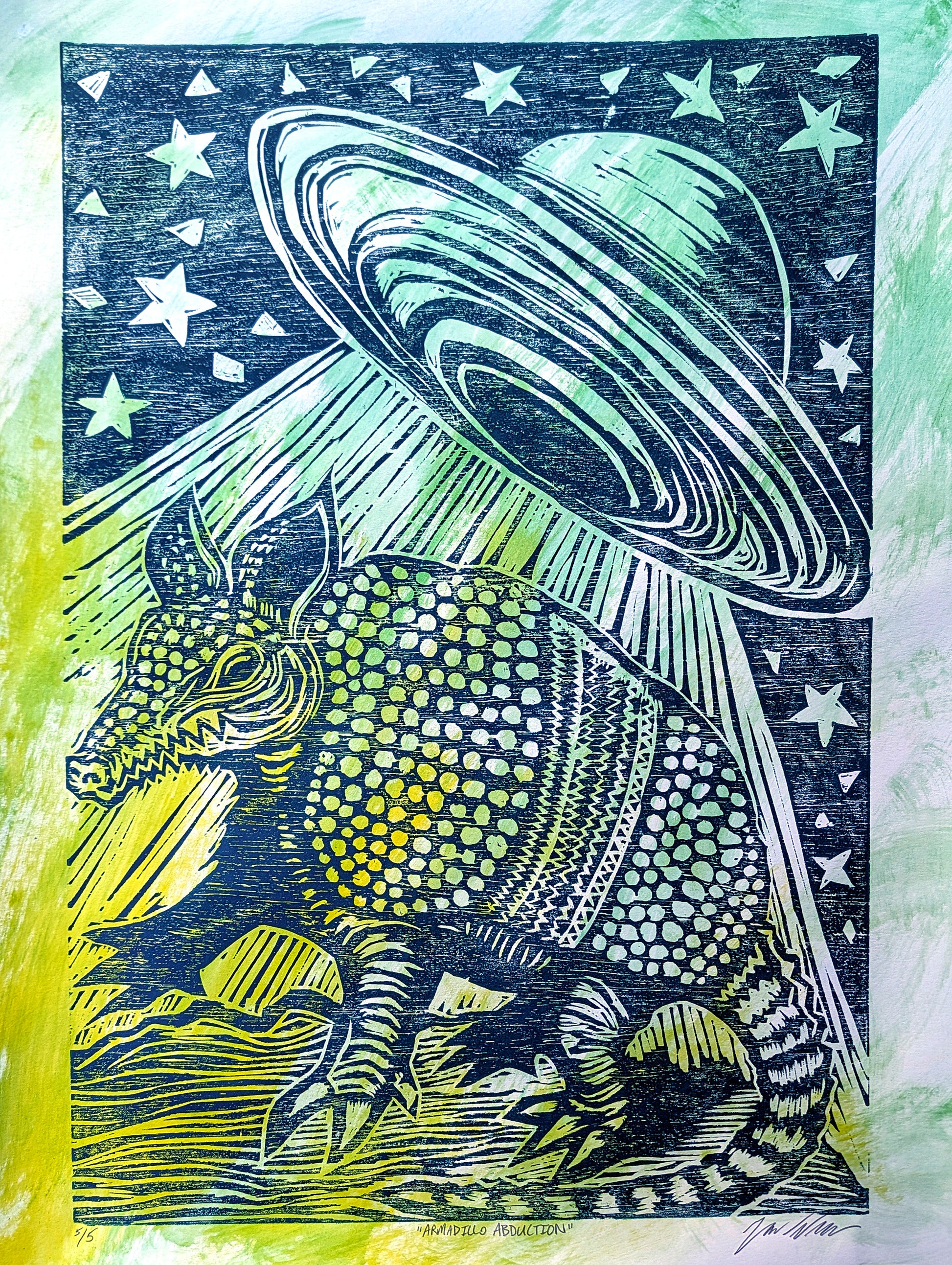 Inspired by the U.F.O.s Over Lubbock, High Plains Print Slinger Show and the 46th Annual ArmadilloCon in Austin, Texas, Jason Wallerstein created this limited edition woodcut print with major science fiction appeal! Grab your armadillo abduction print before the aliens snatch them all up!