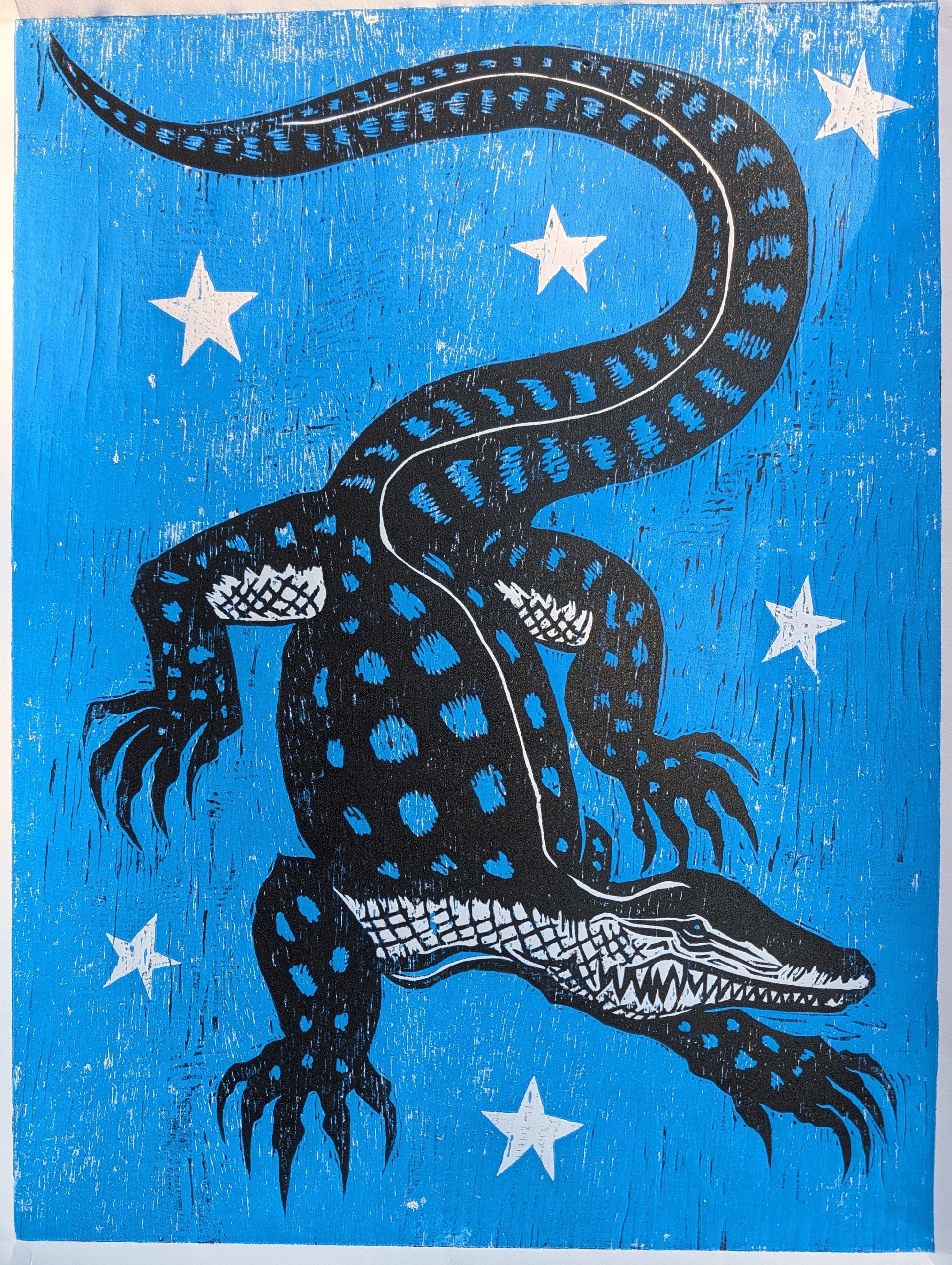 Dive into the vibrant world of "Monitor the Stars," a striking woodblock reduction print that captures the powerful elegance of a monitor lizard amidst a celestial backdrop. This hand-pulled print features a dynamic black monitor lizard adorned with brilliant blue spots, set against an electric blue sky dotted with pristine white stars.