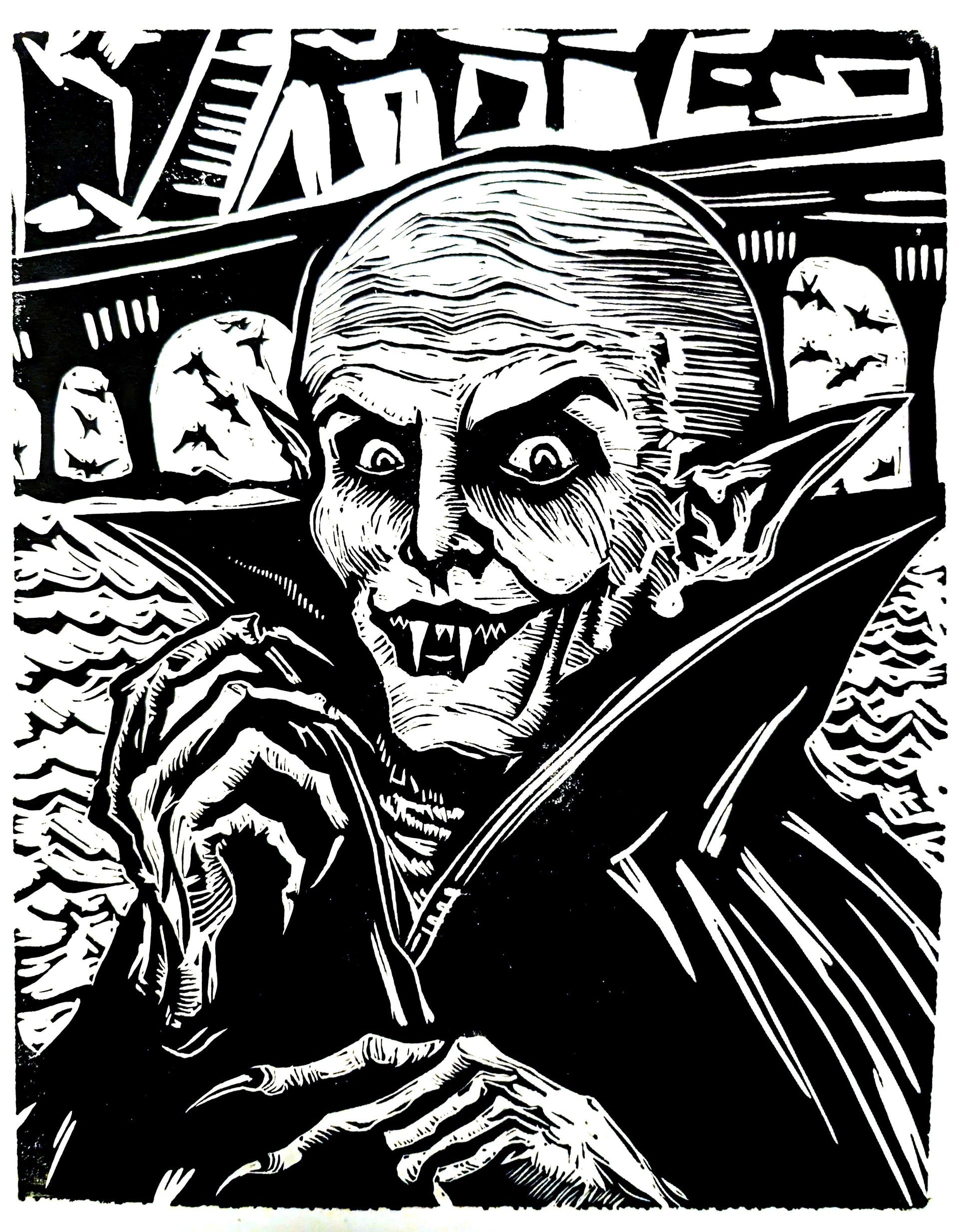 A striking linocut print commemorating the legendary Nosferatu film, this 11"x14" artwork captures the gothic essence of cinema's most iconic vampire. Originally designed for Austin's Nosferatu festival celebrating the film's centennial, this 2026 reprint showcases meticulous craftsmanship on premium Richeson paper. Created using Cranfield safe wash relief ink, the piece demonstrates traditional printmaking techniques with archival quality. Perfect for film enthusiasts, horror collectors, and art aficionados seeking a scary addition to their collection.