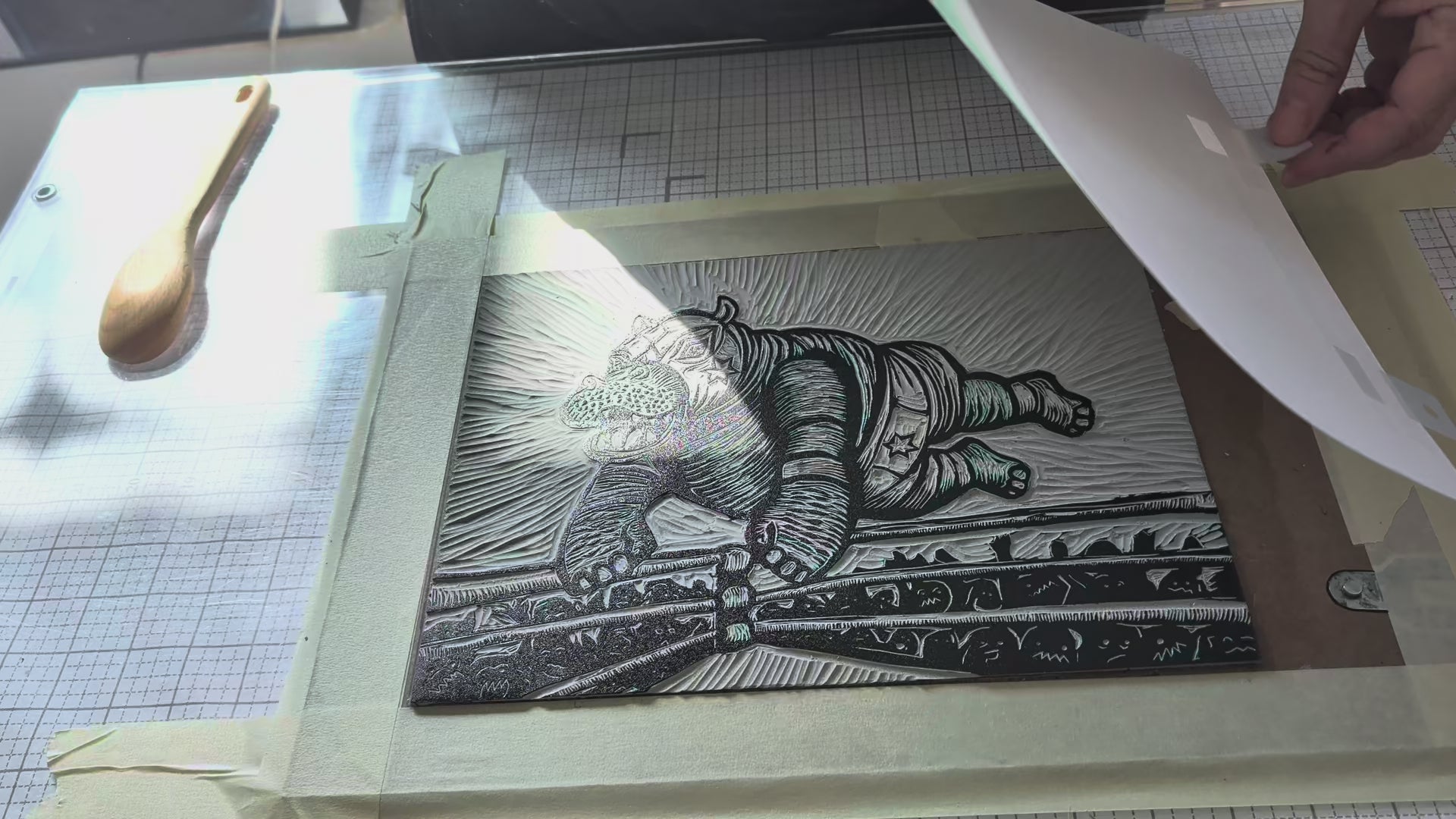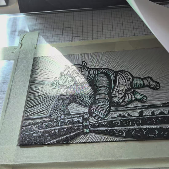 This hand carved linocut print is the first BrunkyArt creation for 2026! Inspired by ATX Jewboy Burgers Owner, Mo Pittle who collects all things Lucha Libre, Jason couldn't resist creating this three color reduction linocut print. Printed using a vintage Whelan printing press on 11x14 inch Archival RIcheson printmaking paper.